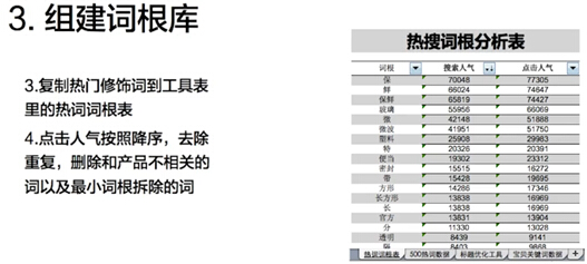 之前组建的还有另外一个表,热门修饰词,把热门修饰词复制到工具箱里面的热词词根表,只需复制词,不需要数据。当把词跟复制完成后,对应的搜索人气和点击人气就会自动匹配出来,这是根据500热搜词而来。接下来是一个优化的步骤,根据点击人气做一个降序排列,删除重复词根,再删除与自己产品不相关的词,属性不相干、风格不相关等等;最小词根的拆除词也要去掉,例如保鲜盒拆出的“保”“鲜”,“保鲜”本身是一个属性词,把保鲜二字再进行拆分就没有太大意义,我们要保证最小单位的词根。