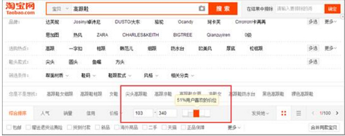那么你的毛呢外套的价格,只要在199到590之间就可以了,这就属于相同的价格区间,就不会乱了标签。哪怕你以后想上高跟鞋,也没关系,你搜索“高跟鞋”: