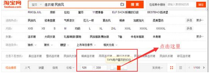 搜索“连衣裙 民族风”,然后看搜索结果页面的价格区间(PC端可以直接看到),无线端要点击一下“筛选”按钮。
