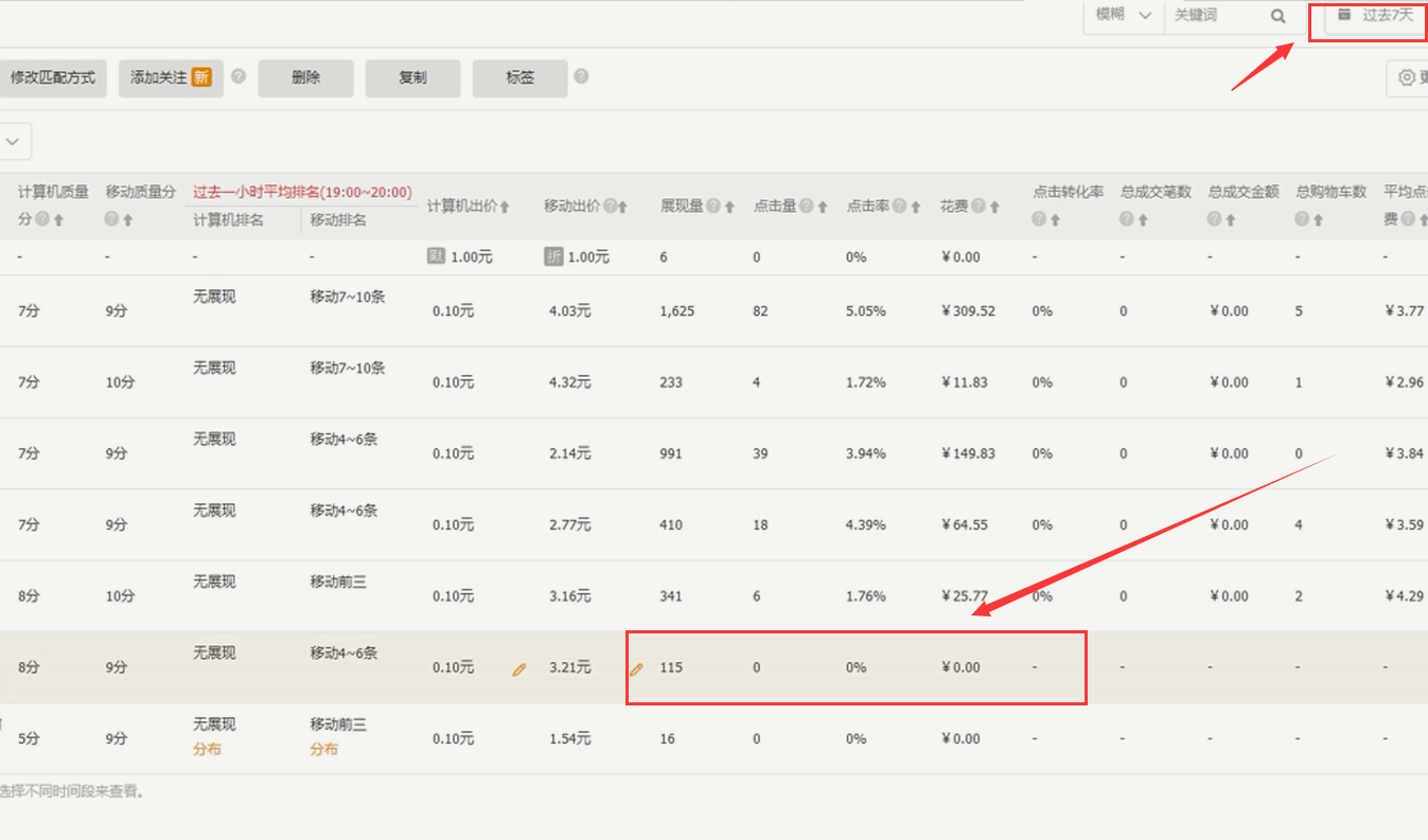 当关键词展现量足够时,我们需要关注的是关键词的点击,创意图是会影响我们的点击率,但如果在图没有问题的情况下,关键词还是没有任何点击的词,或者是点击率低于同行平均标准,而且还没有收藏加购的关键词,可以直接删除。